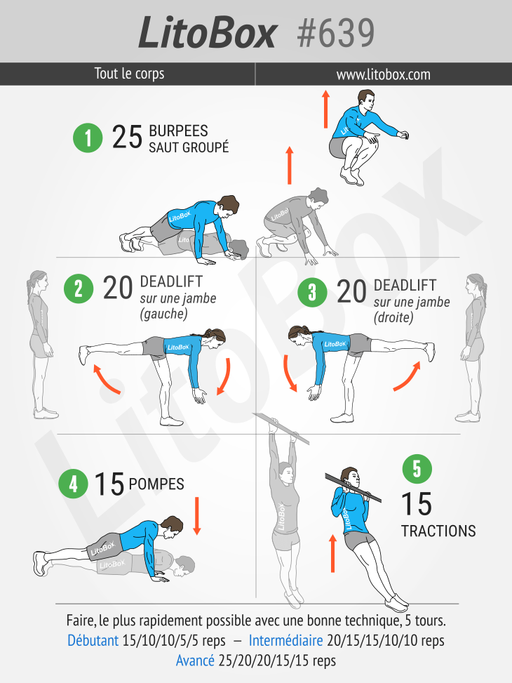 Mode A personnalisé (15 burpees saut groupés, 20 deadlift d’un côté puis 20 deadlift de l’autre, 15 pompes et 15 cobras, le tout 5 fois).