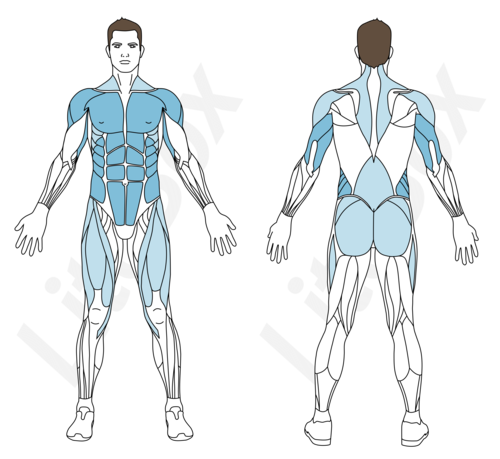 Les principaux muscles travaillés pour les pompes en T sont les pectoraux, deltoïdes, triceps, abdominaux (obliques et muscle droit de l’abdomen).