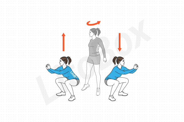 - Amortissez le saut et faites un squat sauté en pivotant sur vous-même en l’air dans le sens opposé.
