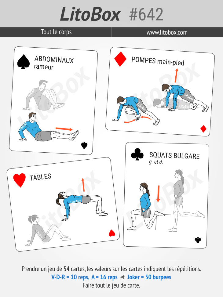 | Intermédiaire | As = 1 répétition et tu joues avec les figures (54 cartes) Joker = 40 burpees |