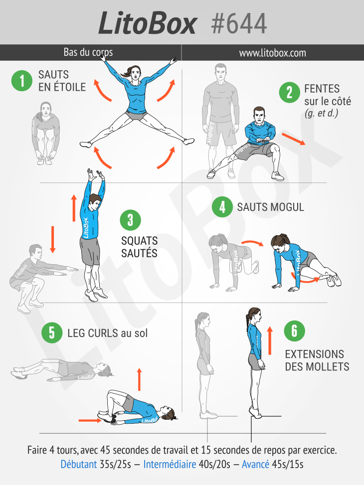 Faire 4 tours avec 45 secondes de travail et 15 secondes de repos par exercice :
