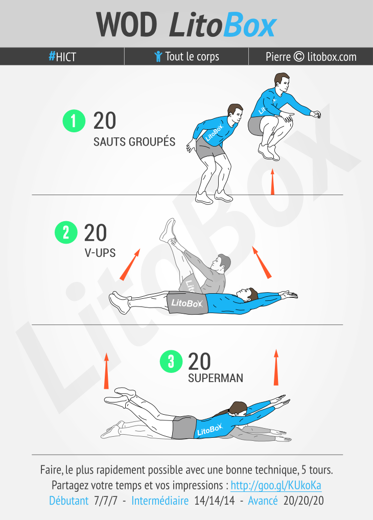 | Intermédiaire | 14 sauts groupés 14 V-ups ou mountain climbers 14 supermans |