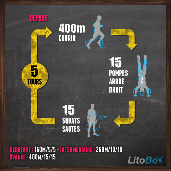 | Intermédiaire | courir 250 mètres 10 pompes en arbre droit 10 squats sautés |
