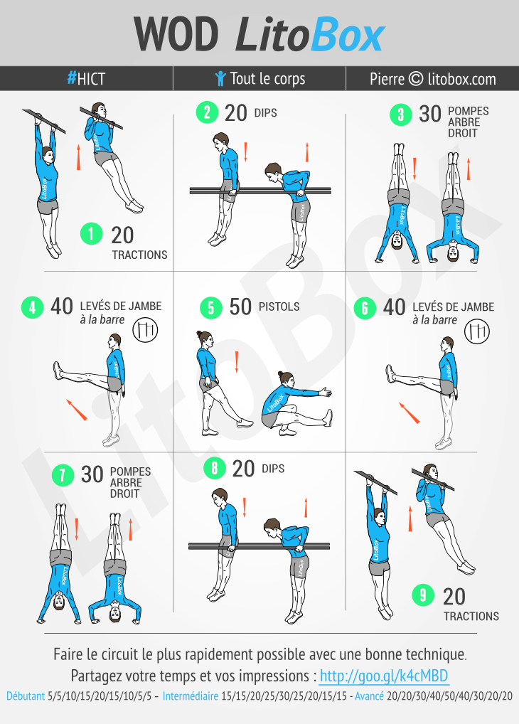 | Intermédiaire | 15 tractions 15 dips 20 pompes arbre droit ou pompes déclinées 25 levés de jambe 30 pistols ou squats sautés 25 levés de jambe 20 pompes déclinées 15 dips 15 tractions |