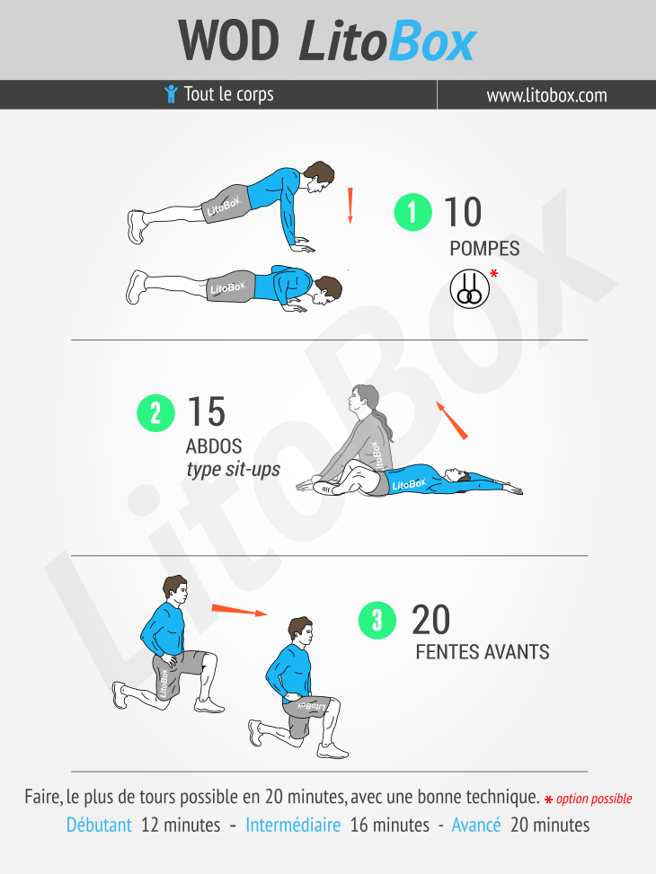 | Avancé | en 20 min de : 10 pompes 15 abdos sit-ups 20 fentes |