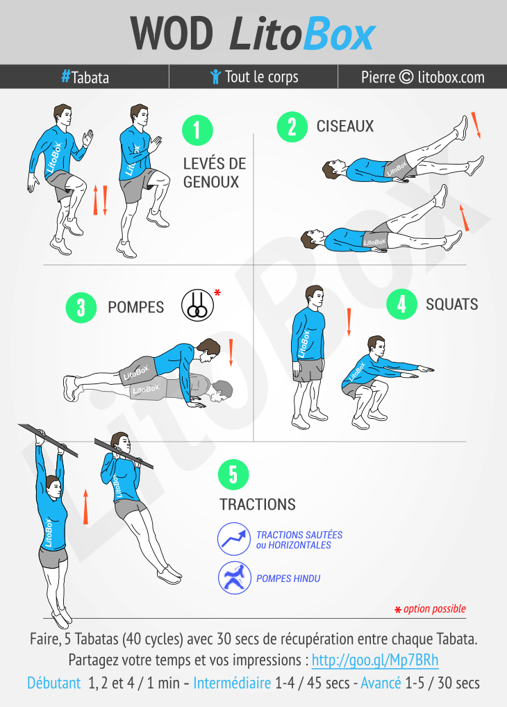 | Avancé | Avec 30 secondes de repos entre chaque Tabata : Tabata levés de genoux tabata ciseaux tabata pompes tabata squats tabata tractions |