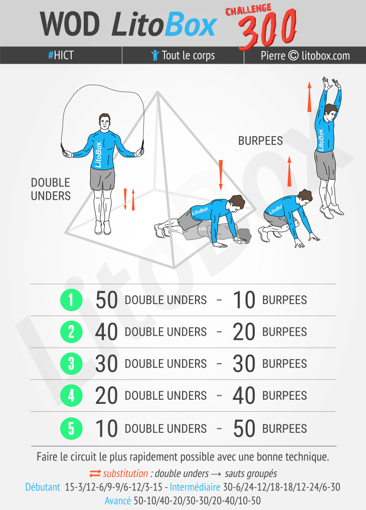 Pour terminer la semaine un challenge Litobox 300 avec un couple double unders et burpees : 300 répétitions pour booster la cardio ! Il est réalisable en 15 minutes. C’est un entraînement pyramidal mais attention les spartiates et les égyptiens c’est plusieurs milliers d’années d’écart 😉