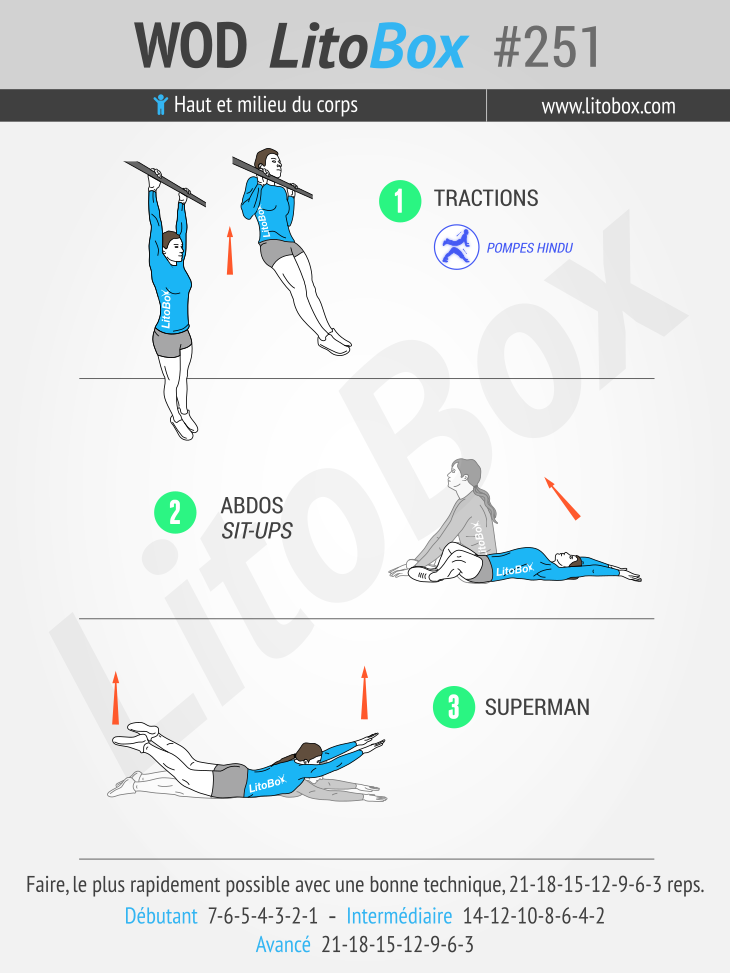 | Avancé | 21-18-15-12-9-6-3 répétitions de : tractions abdos sit-ups superman |