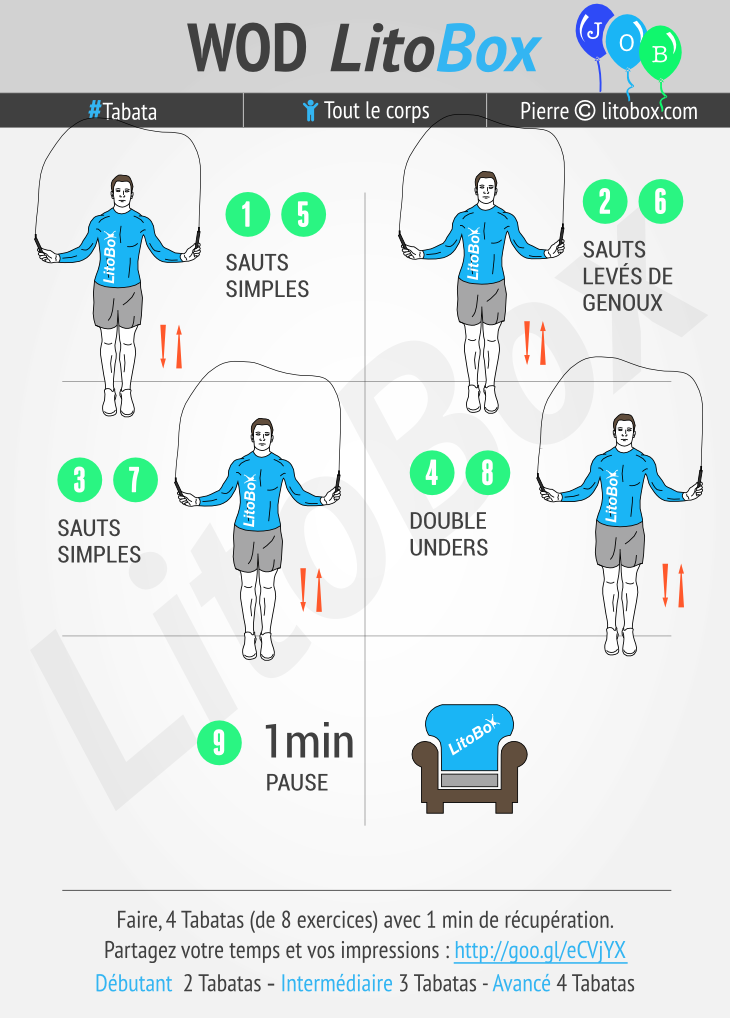 Faire, 4 Tabatas de corde à sauter avec 1 minute de récupération entre chaque.