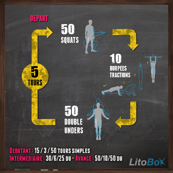 | Avancé | 50 squats 10 burpees tractions 50 double-unders |