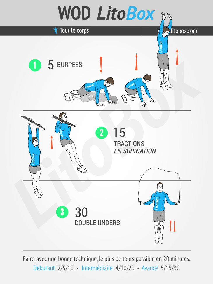 | Débutant | 2 burpees 5 tractions en supination 10 DU |