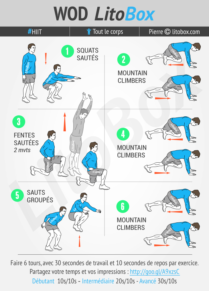 | Intermédiaire | 20 secs ON / 10 secs OFF squats ou squats sautés mountain climbers fentes ou fentes sautées mountain climbers star jumps ou sauts groupés mountain climbers |