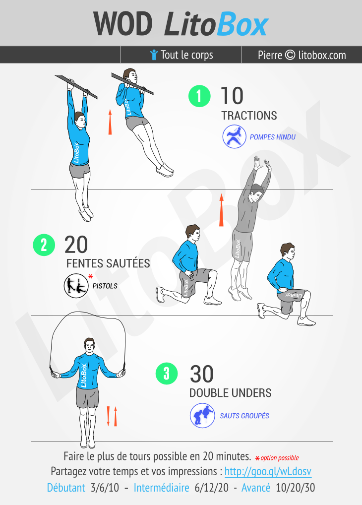 | Avancé | 10 tractions 20 fentes sautées / pistols 30 double-unders |