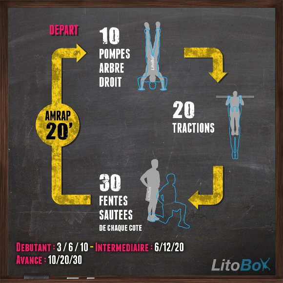 | Intermédiaire | 6 pompes verticales 12 tractions 20 fentes sautées |