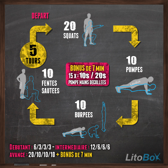 | Avancé | 20 squats 10 pompes 10 burpees 10 fentes sautées | idem |