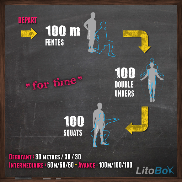 | Avancé | 100m de fentes ou 150 fentes sur place 100 double-unders ou courir 800m ou 100 sauts groupés 100 squats |
