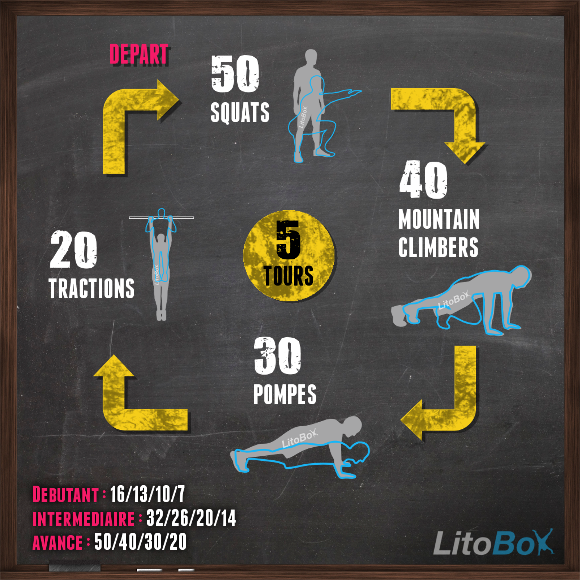 | Intermédiaire | 32 squats 26 mountain climbers 20 pompes 14 tractions |