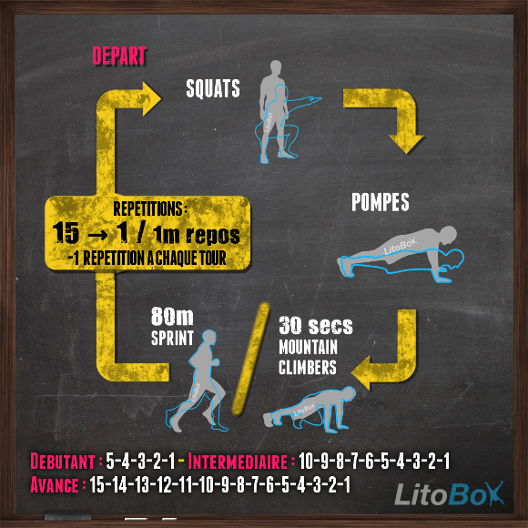 | Avancé | 15-14-13-12-11-10-9-8-7-6-5-4-3-2-1 réps. de : squats pompes sprint 80m ou 30 secondes de mountain climbers avec 1 minute de repos |