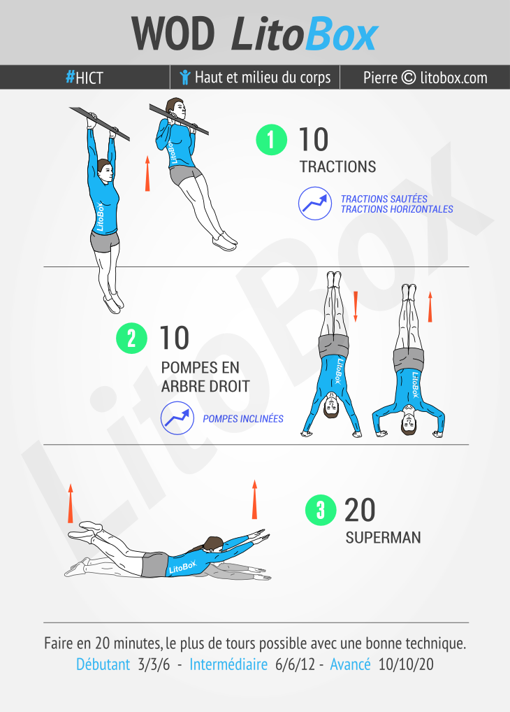 | Avancé | 10 HSPU 10 tractions 20 superman |