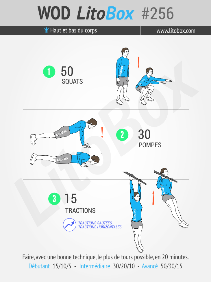 | Avancé | 50 squats 30 pompes 15 tractions |
