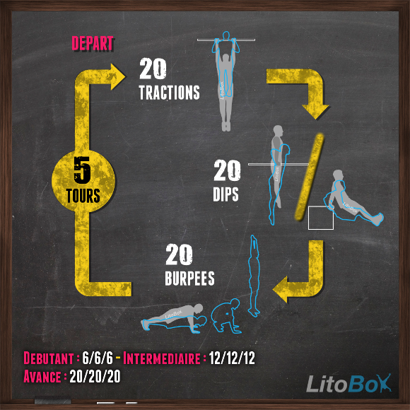 | Avancé | 20 tractions 20 dips 20 burpees |