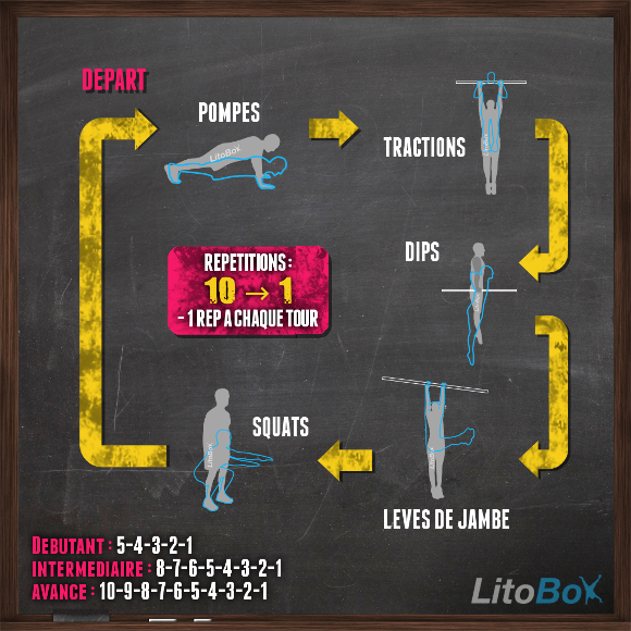 | Débutant | 5-4-3-2-1 répétitions de : pompes tractions dips levés de jambe squats |