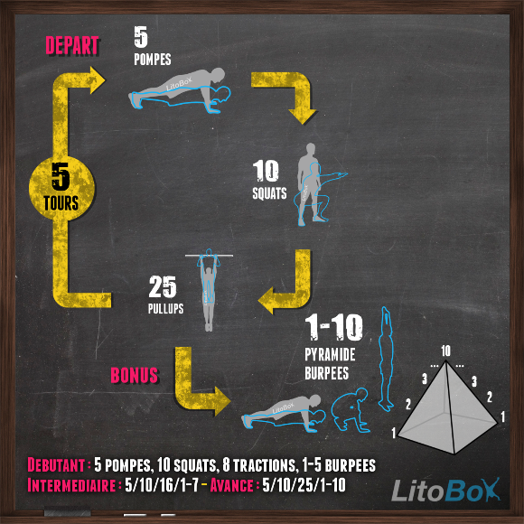 | Débutant | 5 pompes 10 squats 8 tractions puis pyramide burpees 1-5-1 (25 burpees) |