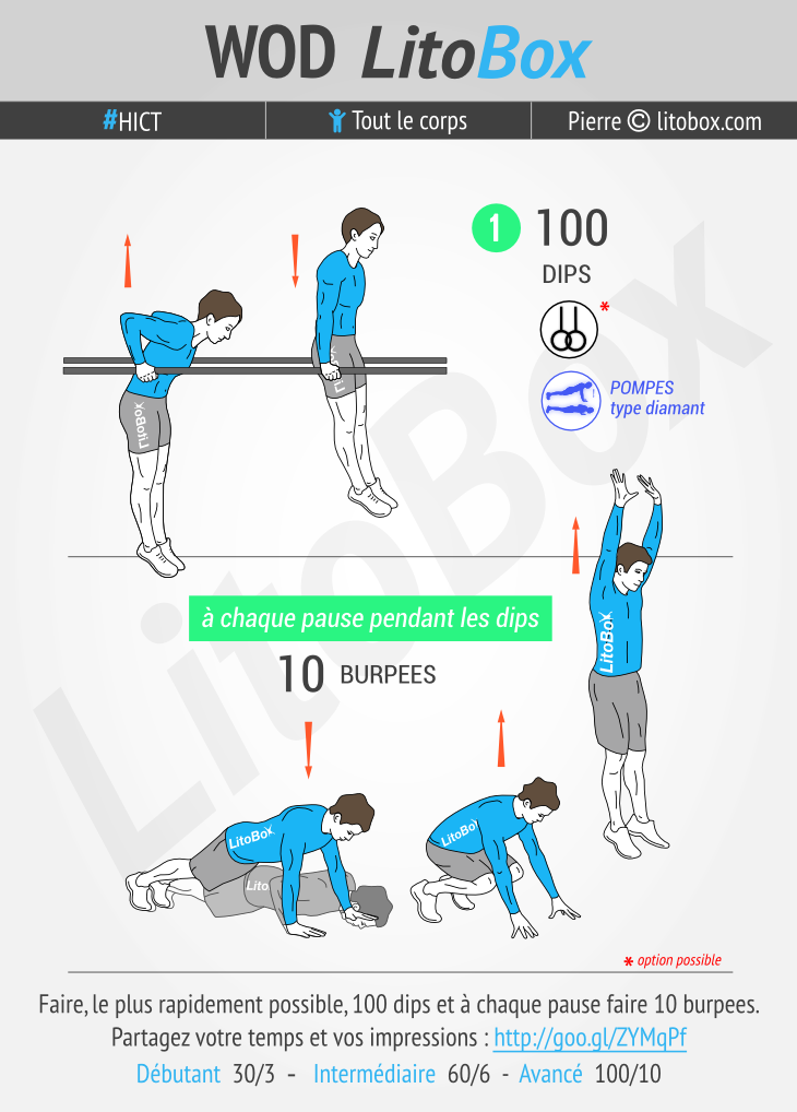Pour ma part j’ai fait 20 dips/burpee/20 dips/burpee/15dips/burpee/15dips/burpee/15dips/burpee/15dips.