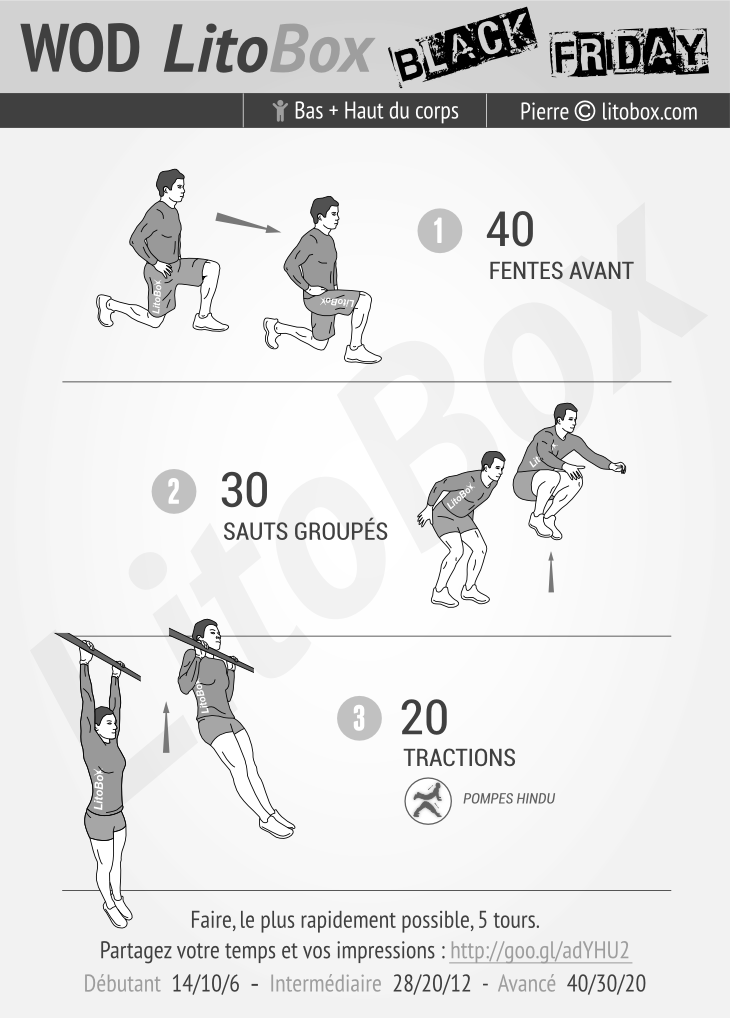 Aujourd’hui pour le Black Friday, je vous propose un WOD pour dépenser des calories, pas votre argent car il n’y a pas de soldes chez Litobox 😉 !