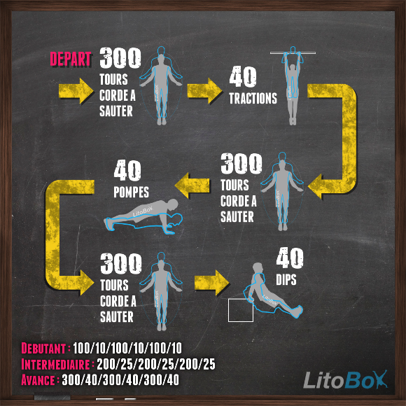 | Avancé | 300 tours de corde à sauter 40 tractions 300 tours de corde à sauter 40 pompes 300 tours de corde à sauter 40 dips |