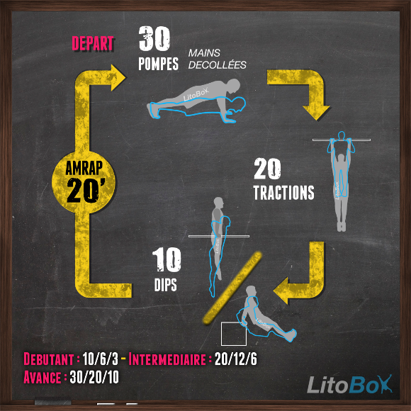 | Intermédiaire | 20 pompes 12 tractions 6 dips |