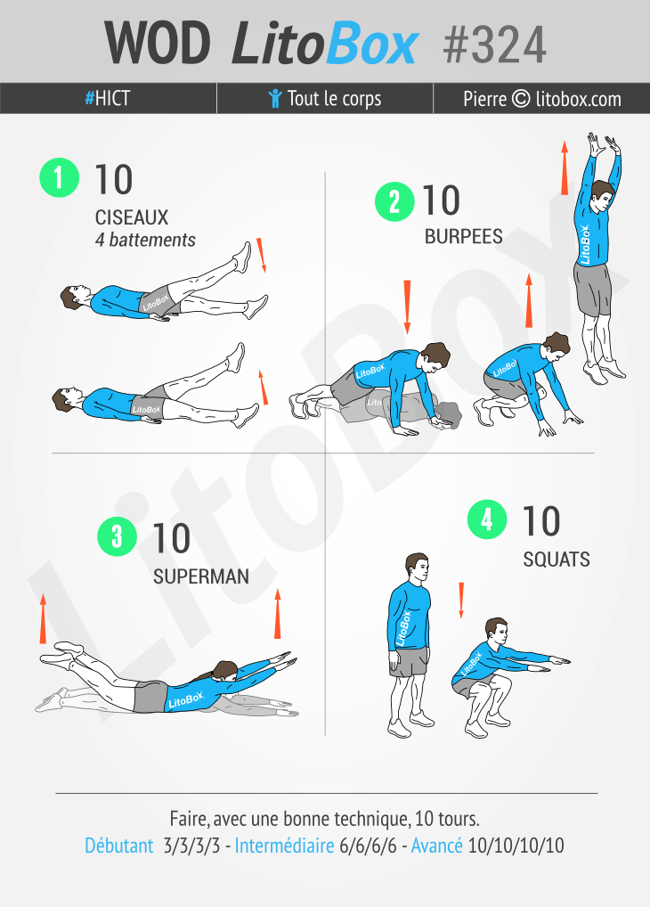 | Avancé | 10 ciseaux 10 burpees 10 superman 10 squats |