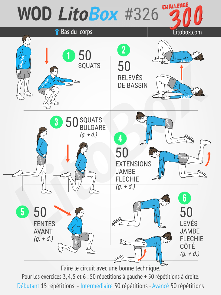Pour cette fin de semaine je vous propose un challenge Litobox 300 spécial fesses et cuisses pour avoir des belles jambes de spartiates 😉 N’oubliez pas la discipline du spartiate : la technique des mouvements avec une bonne amplitude. AOU AOU AOU !