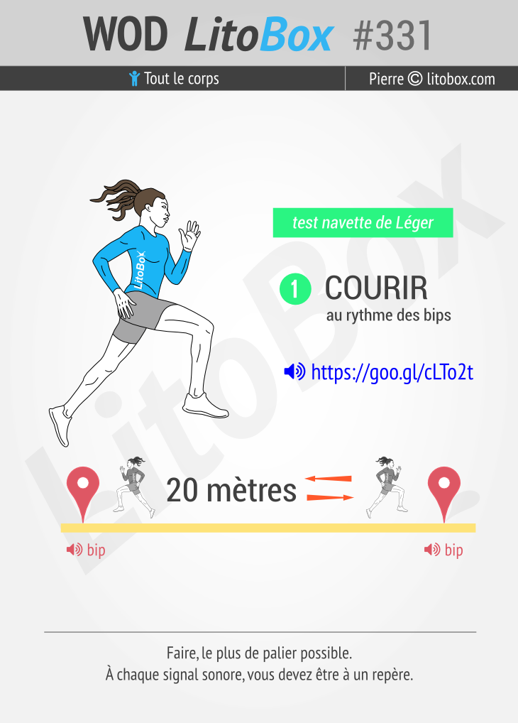 Des liens existent (voir plus haut) avec les paliers et des effets sonores qui t’indiquent quand tu dois être sur la ligne (ou au repère)…. Pour plus de renseignement tape test de Luc Léger sur Google 😉 …. Bon training 🙂