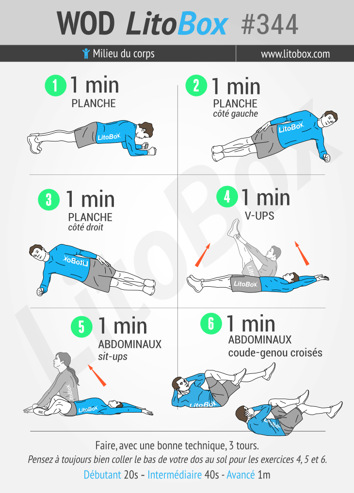 | Débutant | 20 secs planche 20 secs planche à gauche 20 secs planche à droite 20 secs V-ups 20 secs abdos sit-ups 20 secs abdos croisés |
