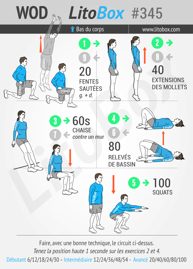 | Débutant | 6 fentes sautées 12 extensions des mollets 20 secondes de chaise 24 relevés de bassin 30 squats 24 relevés de bassin 20 secondes de chaise 12 extensions des mollets 6 fentes sautées |
