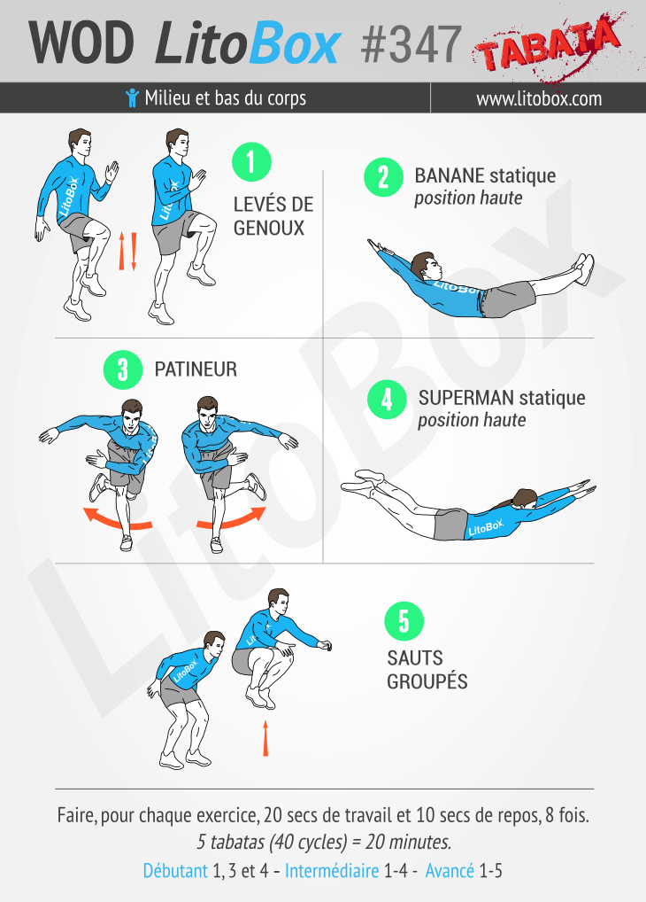 | Intermédiaire | Tabata levés de genoux tabata banane tabata patineur tabata superman |