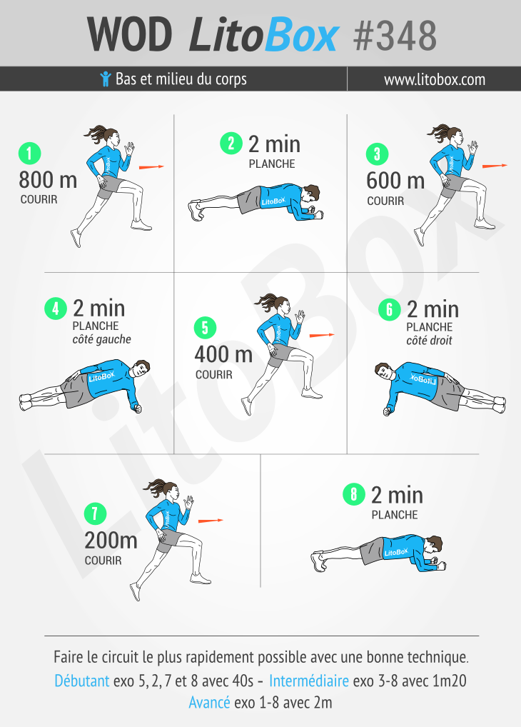 | Avancé | courir 800 m 2 min de planche courir 600 m 2 min à gauche courir 400 m 2 min de planche à droite courir 200 m 2 min de planche |