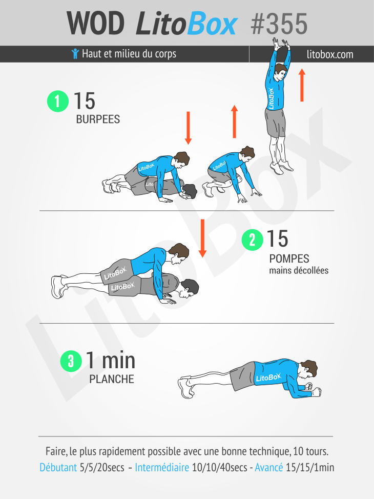 | Avancé | 15 burpees 15 pompes normales ou mains décollées 1 minute de planche |