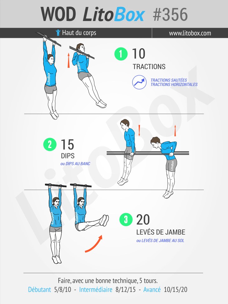 | Avancé | 10 tractions 15 dips 20 levés de jambe |