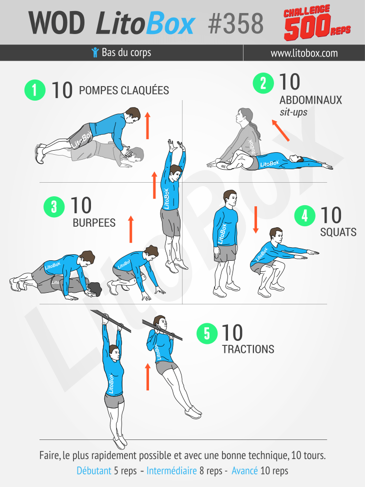 Pour bien profiter du week-end voici un challenge Litobox 500 reps : c’est un entraînement complet un peu plus long que d’habitude où l’on va exécuter 500 répétitions. Tous les muscles du corps travaillent et après on se sent bien 😉 .