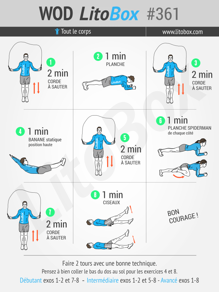 | Avancé | 2 minutes de corde à sauter 1 minute de planche 2 minutes de corde à sauter 1 minute de banane 2 minutes de corde à sauter 1 minute de planche spiderman 2 minutes de corde à sauter 1 minute de ciseaux |