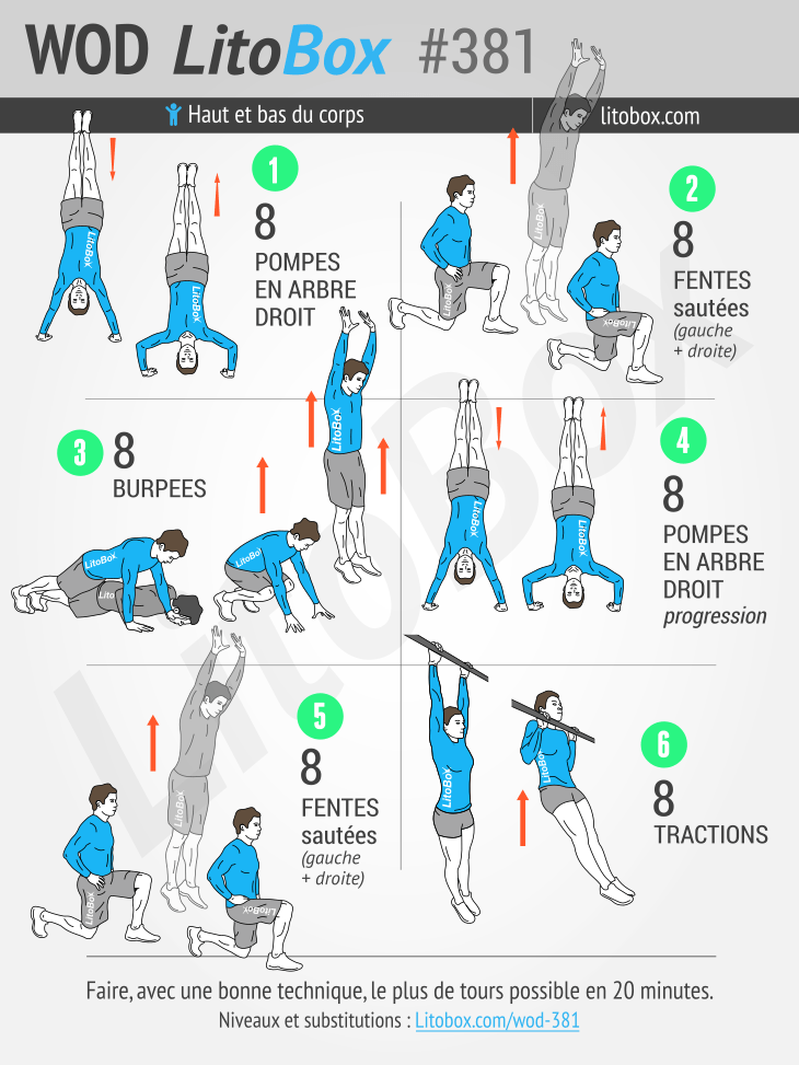 | Avancé | 8 HSPU 8 fentes sautées 8 burpees 8 HSPU 8 fentes sautées 8 tractions strictes |