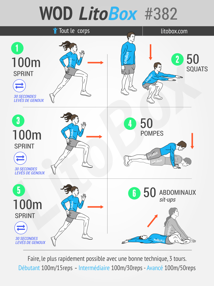 | Intermédiaire | 100m sprint OU 30s de levés de genoux 30 squats 100m sprint 30 pompes 100m sprint 30 abdos sit-up |