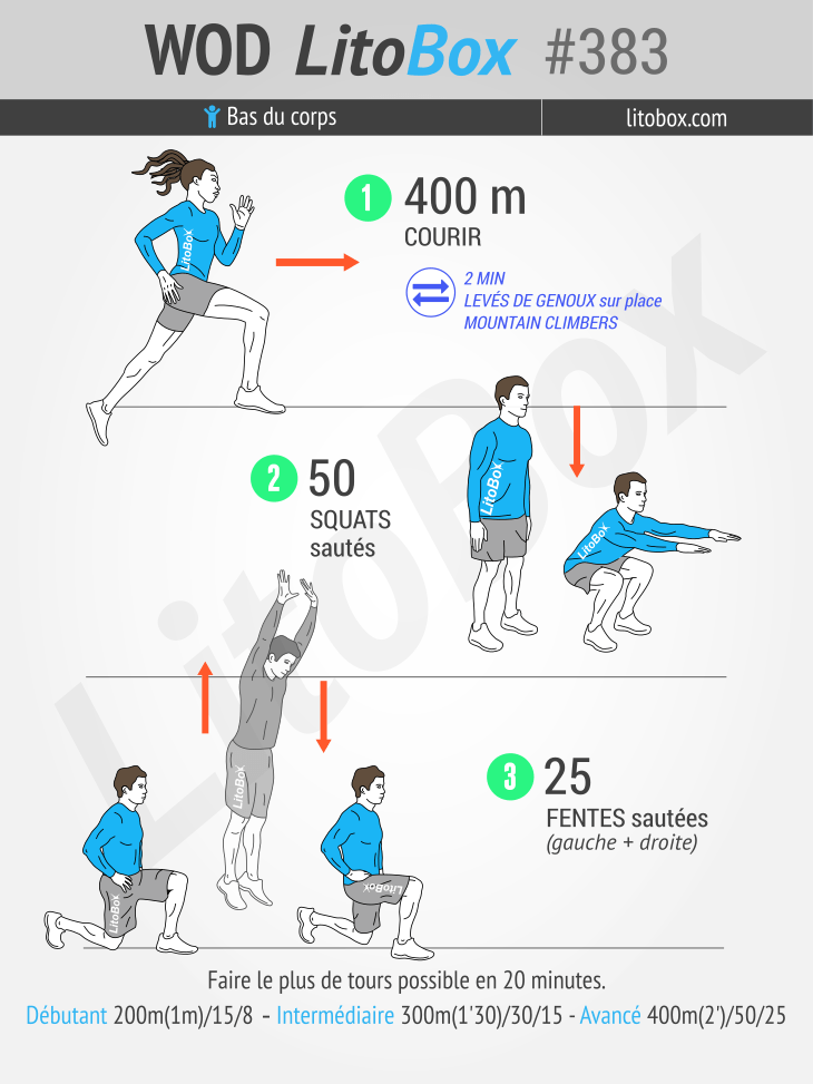| Avancé | courir 400m (2′ LG/MC) 50 squats sautés 25 fentes sautées (à gauche + à droite) |
