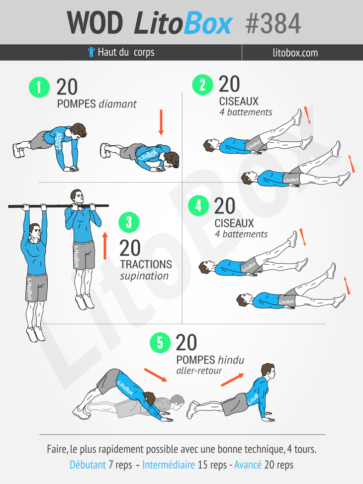 | Avancé | 20 pompes diamant 20 ciseaux (4 battements = 1 répétition) 20 tractions supination 20 ciseaux 20 pompes hindu (aller-retour) |