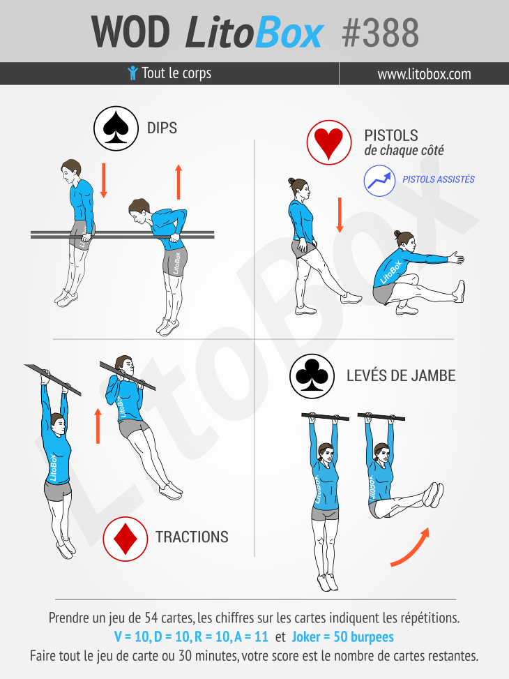 Première fois que je suis un WOD sur le site ! J’ai fait dips à la chaise, pompes sur les genoux, pistols et levés de jambes au sol. Il me reste 14 cartes^^ Je n’ai pas sorti de joker, mais j’ai passé 5 figures d’affilés… C’était cool !