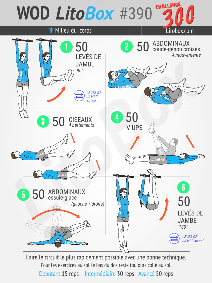 Comme je me suis blessé en début de semaine au pied au jiu-jitsu brésilien (c’est pour cette raison que je n’ai pas pu m’entraîner mercredi); voici un challenge 300 by Litobox spécial abdos ! Amis spartiates, n’oubliez pas la technique : pour les exercices au sol, le bas du dos reste bien collé au sol.