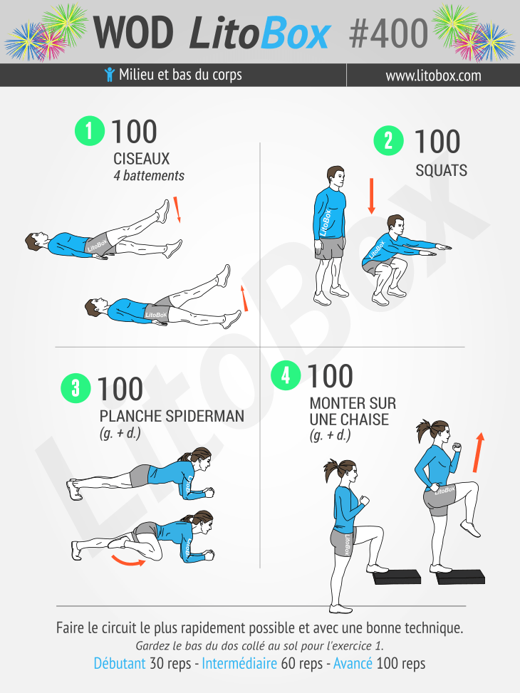 Et voici déjà le 400ème entraînement Litobox 👏 👏 👏 . Ça commence à faire un nombre sympatique de WOD quand on y réfléchi ! Lorsque j’ai commencé Litobox il y a quelques années c’était avec l’objectif de motiver le plus de monde possible à s’entraîner sur le long terme pour avoir une meilleure hygiène de vie durablement. J’espère encore aller le plus loin possible avec vous. Pour fêter ça, je vous propose un entraînement spécial abdos et jambes avec 400 répétitions !