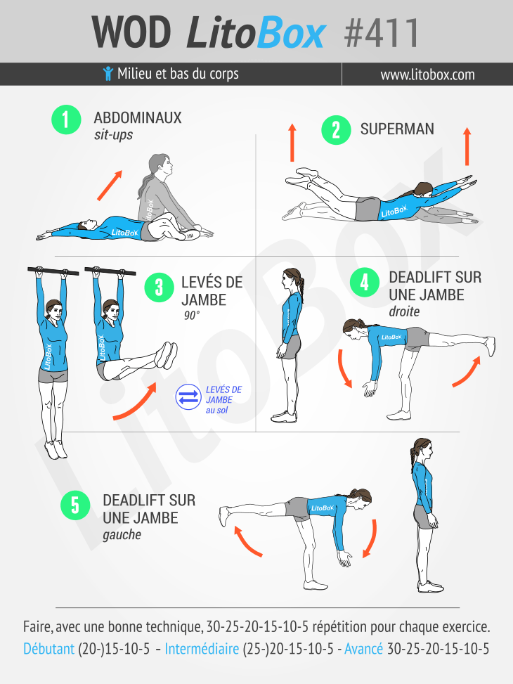 | Débutant | (20-)15-10-5 répétition pour chaque exo de : – abdos sit-ups – superman – levés de jambes au sol – deadlift à droite – deadlift à gauche |
